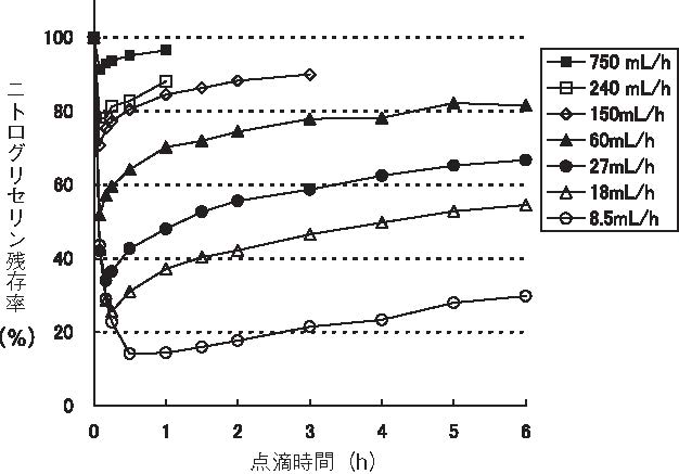 ニトログリセリンは、一般的に使用されている塩化ビニル製の輸液容器及び輸液セット等に吸着し、投与量が正確に静脈内に投与されない。吸着率は点滴速度が遅く、投与セットが長い程高くなる。ニトログリセリン濃度は、吸着率の変化に影響を与えない。点滴速度による影響は図のとおりで塩化ビニル管120cmでは点滴速度150mL/h(2.5mL/min)以上であれば投与量の80%以上が静脈内に注入される3) 。また、塩化ビニル管の長さが長くなる程吸着率は高くなるので、本剤の使用にあたっては点滴速度、塩化ビニル管の長さに十分注意すること。[7.1 参照]
