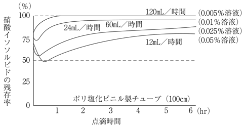 硝酸イソソルビドは、一般に使用されているポリ塩化ビニル製の輸液容器及び輸液セットに吸着するが、ガラス製、ポリエチレン製の容器、器具には吸着しない。硝酸イソソルビドのポリ塩化ビニル製輸液セットに対する吸着率は、図に示す通りで点滴速度に影響され、ポリ塩化ビニル管100cmでは点滴速度60mL/時間(1mL/分)以上であれば、投与量の80%以上が静脈内に注入される。また、硝酸イソソルビドの吸着率は配合濃度に影響されないが、輸液セットが長い程高くなるので注意すること。