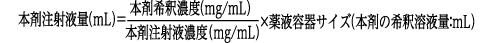 算出された本剤の希釈濃度の薬液を、使用する薬液容器サイズに合わせて調製するために必要な本剤注射液の量は、以下の式より算出する。