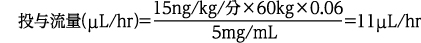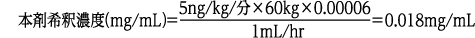 体重60kgの患者に対し、投与速度5ng/kg/分、投与流量1mL/hrで、薬液容器50mLを使用して投与する場合、本剤の希釈濃度は以下のように計算される。