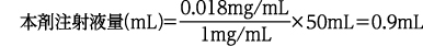本剤の希釈濃度0.018mg/mLで、薬液を50mLに調製するために必要な本剤の注射液量は、20mgバイアル(本剤注射液濃度1mg/mL)を使用した場合、以下のように計算される。
