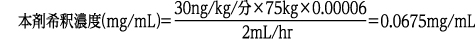体重75kgの患者に対し、投与速度30ng/kg/分、投与流量2mL/hrで、薬液容器100mLを使用して投与する場合、本剤の希釈濃度は以下のように計算される。