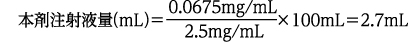 本剤の希釈濃度0.0675mg/mLで、薬液を100mLに調製するために必要な本剤の注射液量は、50mgバイアル(本剤注射液濃度2.5mg/mL)を使用した場合、以下のように計算される。
