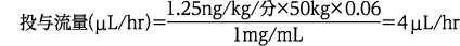 体重50kgの患者に対し、20mgバイアル(本剤注射液濃度1mg/mL)を使用し、投与速度1.25ng/kg/分で投与を行う場合、以下のように計算される。
