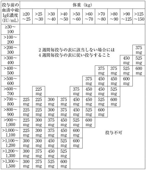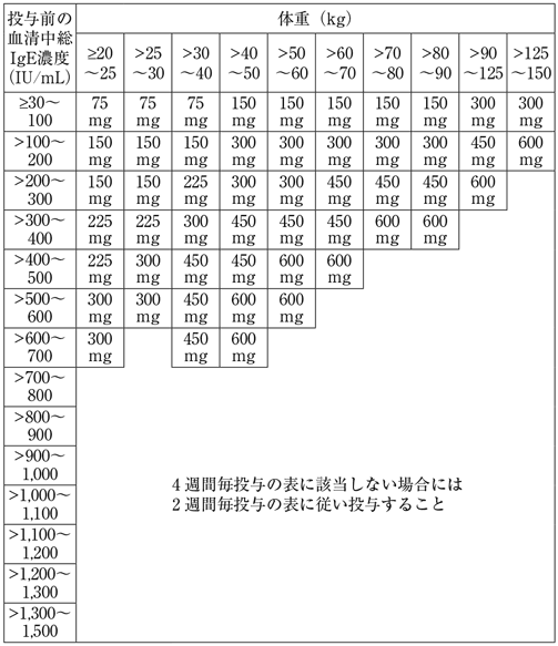 通常、オマリズマブ(遺伝子組換え)として1回75~600mgを2又は4週間毎に皮下に注射する。1回あたりの投与量並びに投与間隔は、初回投与前血清中総IgE濃度及び体重に基づき、下記の投与量換算表により設定する。