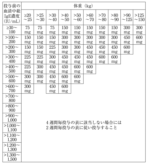 通常、オマリズマブ(遺伝子組換え)として1回75~600mgを2又は4週間毎に皮下に注射する。1回あたりの投与量並びに投与間隔は、初回投与前血清中総IgE濃度及び体重に基づき、下記の投与量換算表により設定する。