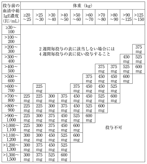 投与液量一覧表 オマリズマブ(遺伝子組換え)投与量