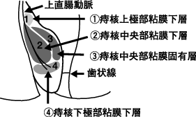 (4) 痔核下極部の粘膜下層への投与: