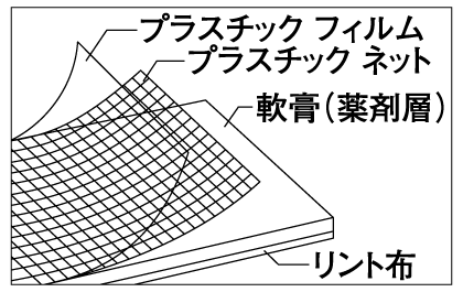 四層構造:プラスチックフィルム(分割線入り)・プラスチックネット・軟膏・リント布