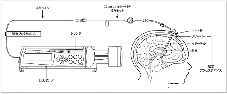 (2) 本剤及びフラッシュ溶液は外科的に留置した脳室アクセスデバイス(リザーバー及びカテーテル)を含む脳室内投与システムを用いて投与する(図1)。脳室アクセスデバイス、注入ポンプ及びチューブ等の医療機器の添付文書、取扱説明書等を熟読し、これらの注意に適切に対応すること。
