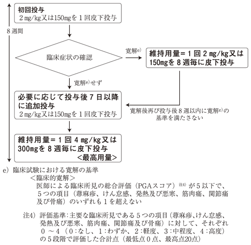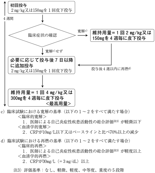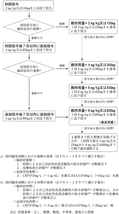 十分な臨床的効果(皮疹及び炎症症状の寛解)がみられない場合には適宜漸増するが、1回最高用量は体重40kg以下の患者では8mg/kg、体重40kgを超える患者では600mgとする。