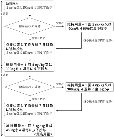 1. 7.3 投与は1回2mg/kg又は150mgの低用量から開始し、十分な効果がみられない、もしくは再燃がみられた場合に限り、下図を参考に投与量の増量を行うこと。[17.1.1 参照],[17.1.5 参照],[17.1.6 参照]