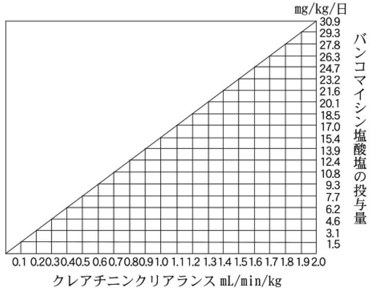 7.2 腎機能障害患者では健康者より血中濃度の半減期が延長するので、投与量を修正して使用する必要がある。クレアチニンクリアランスから投与量を修正する目安は下図により算出できる1)