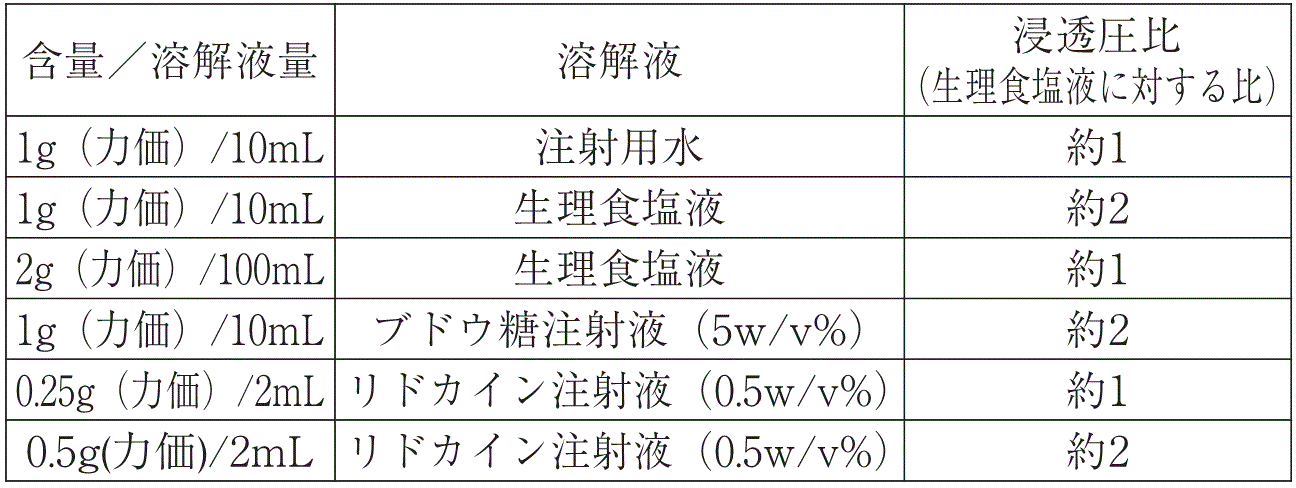 本剤を注射用水、生理食塩液、ブドウ糖注射液又はリドカイン注射液に溶解したときの浸透圧比は下表のとおりである。