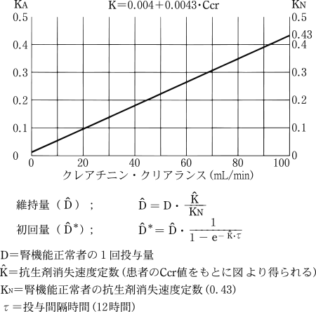 - 7.1 腎機能障害患者では、血中濃度の半減期が延長し、高い血中濃度が長時間持続して、第8脳神経障害又は腎障害があらわれるおそれがあるので、腎機能障害度に応じて、次のような方法により投与量及び投与間隔を調節すること。[9.2 参照]