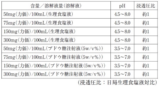 生理食塩液、ブドウ糖注射液に溶解したときのpH及び浸透圧比は下表のとおりである。